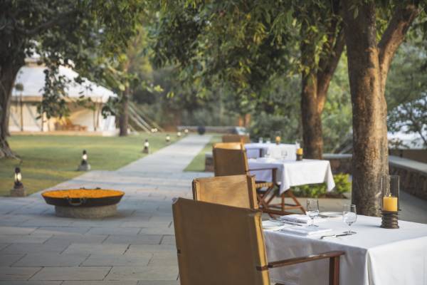 Zum Luxuscamp Aman-i-Khás gehört selbstverständlich auch ein exzellentes Restaurant. In dem eleganten Dining-Zelt serviert man bei romantische Licht traditionelle Gerichte aus Rajasthan, die von den Mogulkaisern inspiriert wurde, sowie internationale Köstlichkeiten.