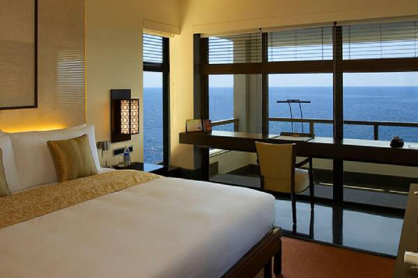 Das Luxusresort The Raviz Kovalam thront majestätisch auf einer Felsspitze zwischen zwei Sandstränden und bietet einen atemberaubenden Ausblick auf das Meer und über die Küste.