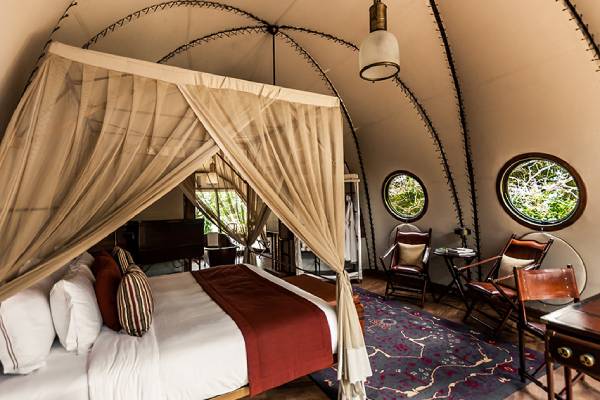Die 28 luxuriöse Zelte sind mit Himmelbetten, hohen Decken und doppelt verglasten Fenstern, die den Blick auf die üppige Dschungelumgebung freigeben, ausgestattet. Klimaanlage, fließend warmes Wasser sowie Wi-Fi sind nur einige der luxuriösen Annehmlichkeiten in dieser Lodge.