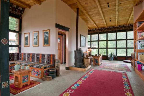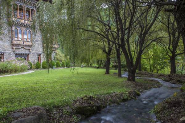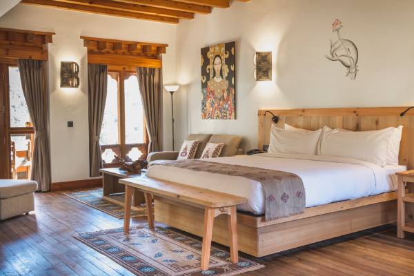 Die insgesamt 45 wunderschön eingerichteten Zimmer und Suiten befinden sich entweder im Haupthaus oder in den 8 zwei- und dreistöckige Cottages, die im klassischen bhutanischen Stil erbaut wurden. Kunstvolle, handbemalte Fassaden- und Deckendetails, filigrane Steinmetzarbeiten sowie die wunderschöne nächtliche Beleuchtung verleihen dem gesamten 10 Hektar großen Grundstück ein besonders majestätisches Flair.