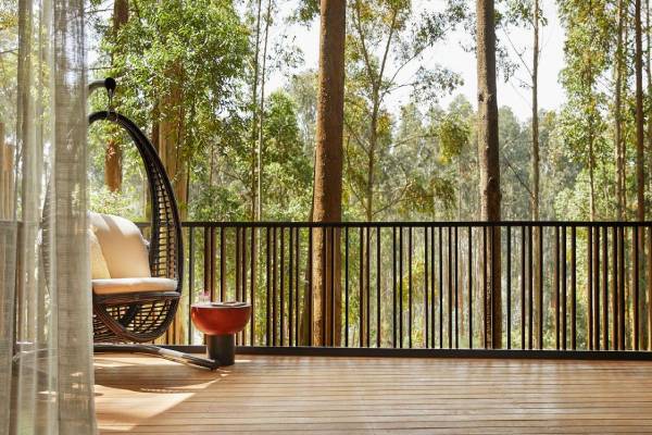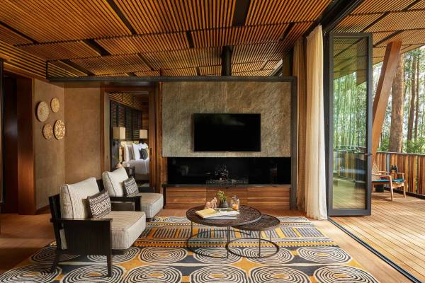 Dieser einzigartige Rückzugsort beherbergt insgesamt 14 luxuriöse Zimmer und sieben Suiten, die alle von Bäumen umgeben sind und eine ultimative Privatsphäre gewährleisten. Traditionelle Kunst füllen jeden Raum mit Wärme und reicher Geschichte, während große Glasflächen sowie weitläufigen Aussichtsdecks mit Außenwannen den Blick auf den Wald freigeben.