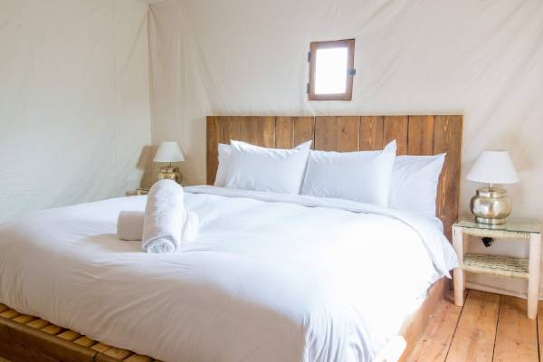 Neben den Lodges verfügt das Luxuscamp auch über 20 Premium-Luxuszelte im Beduinenstil. Jedes Luxuszelt verfügt über ein Doppelbett oder ein Kingsize-Bett. Eine Mischung aus traditioneller Berber- und moderner marokkanischer Architektur inspiriert das Design. Die Zelte sind mit einer Warmwasserdusche und einer privaten Holzterrasse mit Berberkissen und Stühlen ausgestattet, von der aus man am Abend den Sternenhimmel über der Wüste beobachten kann.