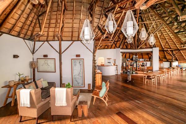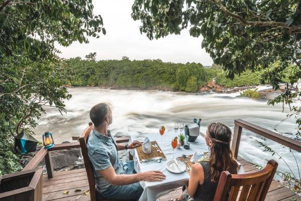 Erhöhte Holzstege verbinden die Zimmer mit dem Restaurant und dem Barbereich und bieten einen unvergesslichen Spaziergang durch den Wald. Die Hauptlodge befindet sich in schöner Lage auf einer Felshalbinsel inmitten der Stromschnellen des Nils. Hotelgäste können sich hier entspannen oder in den angrenzenden Swimmingpool eintauchen.
