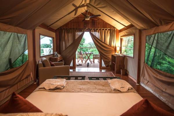 Das Camp verfügt über lediglich neun exklusive Safarizelte, die auf Holzplattformen errichtet sind und Komfort sowie Privatsphäre in der atemberaubenden Wildnis bieten. Sie sind geräumig und ansprechend eingerichtet und verfügen über ein eigenes Bad mit Warmwasserdusche. Alle Zelte verfügen auch über einen großen Balkon mit Hängematten und Stühlen, von dem aus man die herrliche Aussicht auf den Nationalpark und den Pazifischen Ozean genießen kann.