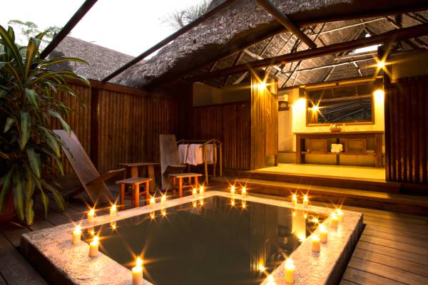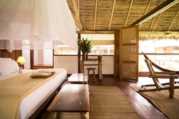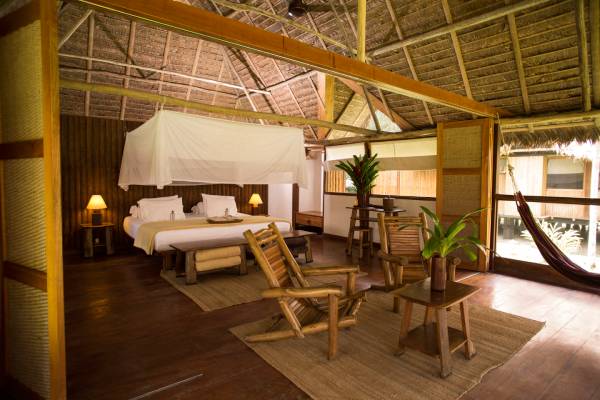 Die 35 privaten strohgedeckten Cabañas und Suiten der Lodge sind vom Design der Ureinwohner des Amazonas inspiriert und kombinieren natürliche Materialien mit modernen Annehmlichkeiten. Alle verfügen über eine abgeschirmte Veranda und Hängematten, tropische Deckenventilatoren, Warmwasserduschen, Laternen, umweltfreundlichen Strom und Bio-Badeprodukte. Die größeren Suiten warten mit zusätzlichen Annehmlichkeiten wie private Terrassen, Plunge-Pool und Außenduschen auf. Das Rauschen des Dschungels im Hintergrund trägt zu der magischen und bezaubernden Atmosphäre bei.