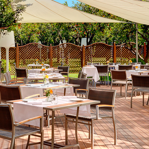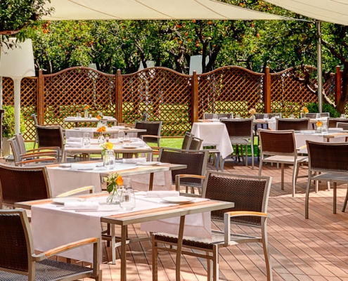 Die große Gartenanlage mit Zitrusfrüchten, Olivenbäumen und mediterranen Pflanzen ist eine wahre Ruheoase und lädt die Hotelgäste zum Entspannen ein. Eingebettet in diesem mediterranen Garten befindet sich auch der große Außenpool, in dem man sich nach einer interessanten Besichtigungstour herrlich erfrischen kann.