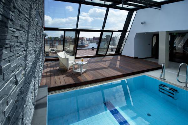Ein Innenpool auf der verglasten Dachterrasse mit Panoramablick lädt zum Entspannen nach einer interessanten Stadtbesichtigung in Danzig ein.