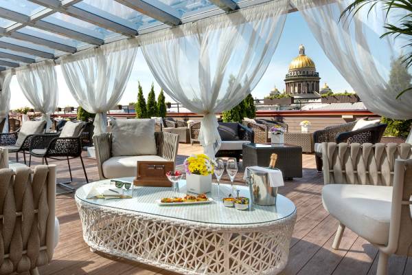 Die Restauranteinrichtungen des Hotels umfassen vier verschiedene Bereiche. Frühstück, Mittag- und Abendessen werden im Lounge Restaurant unter einer imposanten Glaskuppel serviert während man ostasiatische Köstlichkeiten im japanischen Premium-Restaurant MEGUmi genießen kann. Die stilvolle Bar Siniy Most und die Bar auf dem Dach L Terrasa mit spektakulärem Blick über den Isaaksplatz vervollständigen die gastronomischen Einrichtungen des Hotels.