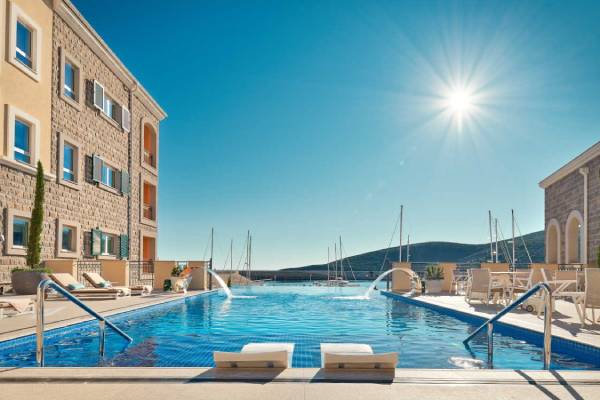 Der mit Sonnenliegen gesäumte Außenpool ist der ideale Ort, um ein paar Sonnenstrahlen zu tanken, aber das Chedi Luštica Bay verfügt auch über einen eigenen Privatstrand.