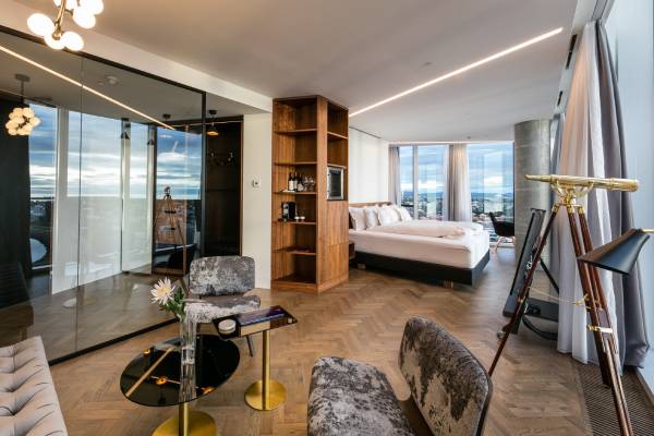 Jede der acht Suiten verfügt über ein elegantes Badezimmer und ist im skandinavischen Chic ausgestattet. Die raumhohen Panoramafester eröffnen eine atemberaubende Aussicht auf die Stadt und die umliegenden Landschaften.