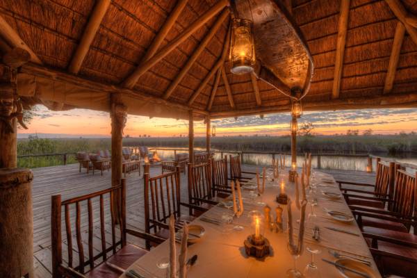Ein erhöhter, strohgedeckter Gästebereich ist so positioniert, dass er den Khwai-Fluss und die Lagune überblickt. Er besteht aus einer Open-Air-Lounge mit großen bequemen Sofas und einem eleganten Essbereich, in dem hervorragende Mahlzeiten serviert werden.