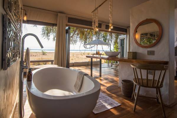 Die sieben luxuriösen Zelte des luxuriösen Chikwenya Camps stehen auf niedrigen Holzdecks mit Holzstegen, die sie mit den erhöhten Gemeinschaftsbereichen verbinden. Es gibt zwei Familiensuiten, die jeweils mit einem eigenen Plunge-Pool ausgestattet sind.