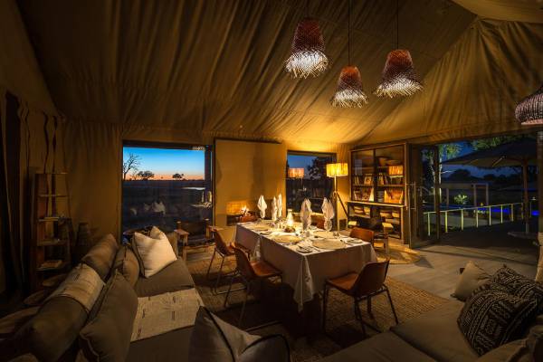 Eine Kombination aus modernem und klassischem Dekor im Safari-Stil schmückt die acht luxuriösen Zelte des Camps sowie ein Familienzelt, die alle einen Blick auf ein beliebtes Wasserloch bieten.