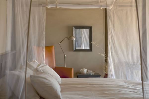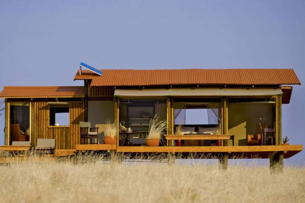 Die Wolwedans Dune Lodge verfügt über neun geräumige Chalets mit eigenem Bad und privater Veranda, von denen man den Panoramablick genießen kann. Die Chalets wurden raffiniert gestaltet und sind auf einer Seite offen, sodass man den Sonnenaufgang von seinem Bett aus beobachten kann.