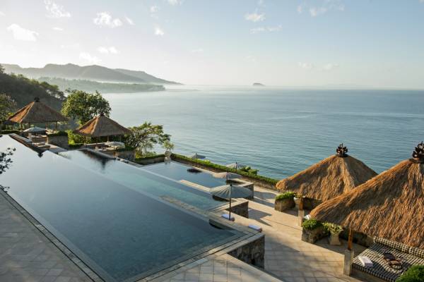 Nahe bei Candi Dasa, thront an der Ostküste Balis das stilvolle Amankila über den blau glitzernden Ozean. Im Hintergrund der imposante Agung-Vulkan, im Vordergrund die Meerenge von Lombok – welch eine fantastische Lage für dieses Luxusresort!
