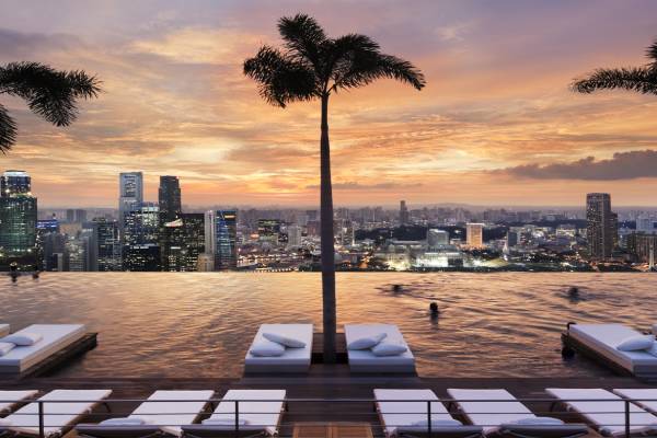Das Luxushotel der Extraklasse befindet sich an der Marina Bay und ist berühmt durch seine futuristische Architektur. Drei Hoteltürme mit jeweils 57 Etagen ragen rund 200 Meter in die Höhe und sind in den obersten Stockwerken miteinander verbunden. Wie das Burj Al Arab in Dubai ist das Marina Bay Sands in Singapur mit seinem extravaganten Design schon zum Wahrzeichen der Stadt geworden.