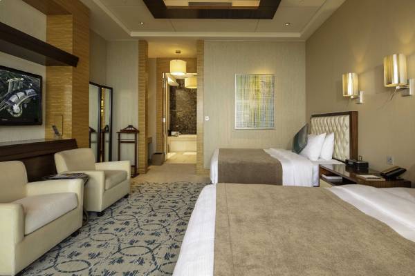 Das Luxushotel verfügt über insgesamt 2.561 elegante Zimmer und Suiten, die sich in den drei Hoteltürmen verteilen. Hotelgäste der Club-Zimmer residieren in den Stockwerken 35 bis 49 mit einem schönen Ausblick auf die Stadt sowie einem exklusiven Zugang zu einer Club-Lounge, in der ein separates Frühstück, kostenfrei diverse Getränke und Snacks sowie am Abend Cocktails gereicht werden.